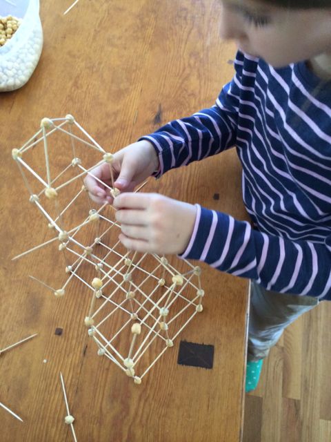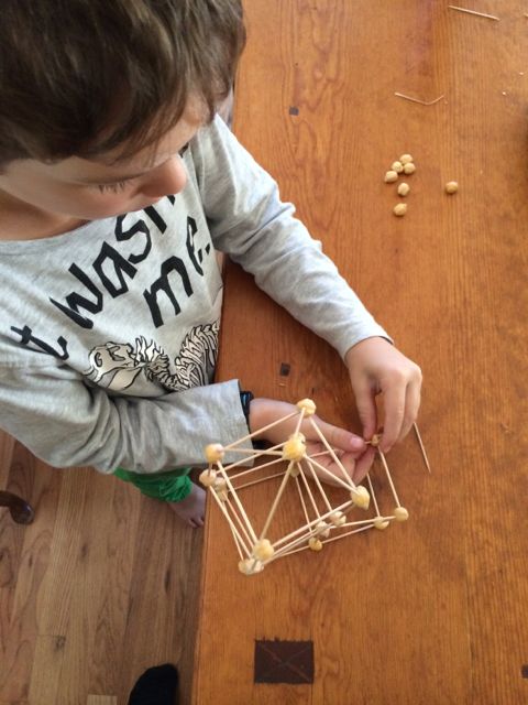 We put dried chickpeas (I don’t think the ones in the can would work as well) in water overnight. Afterwards great constructions can be built with them. It wasn’t just fun for our kids.