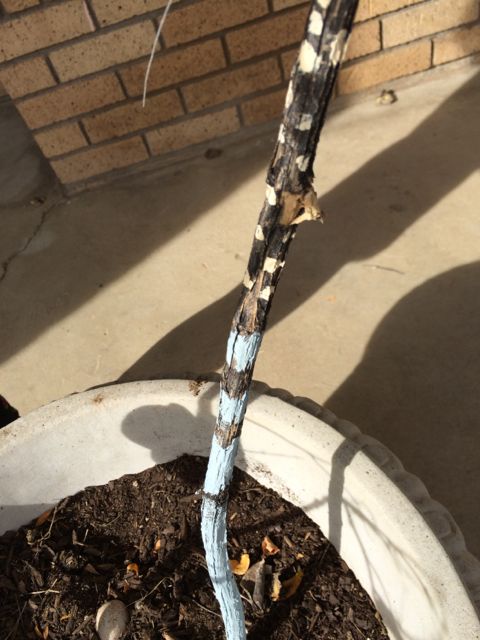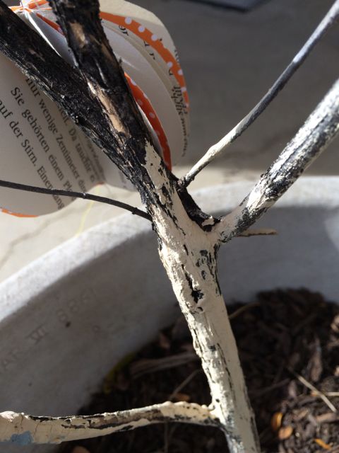 branches – the flowerpot had some weeds growing out of it and was sitting in our backyard. The branches we cut out of our vegetable garden, so far there wasn’t enough room in our green trash for them. To make them look a bit more decorative, the kids painted parts of them.