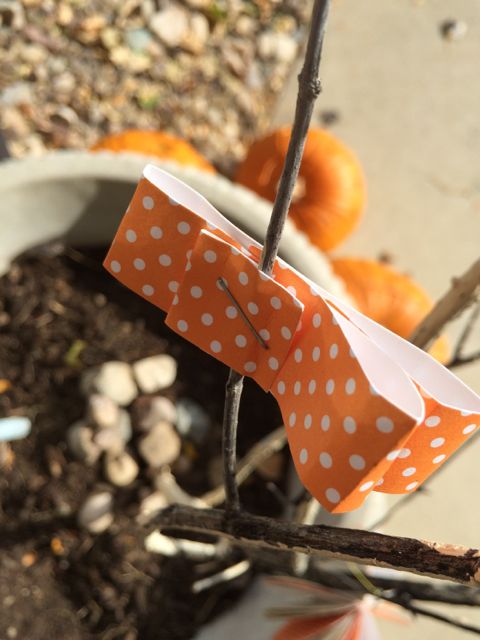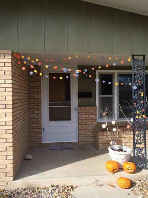Since we are taking part in everything we decided to decorate our entrance as well. I didn’t want it to be scary, so it isn’t the real Halloween-thing, maybe I should call it our fall decorations…Inspired by the pumpkins we wanted the color to be orange and the forms to be round. We also wanted to make sure that the whole thing is budget friendly. We only bought the pumkins and a sheets of orange and yellow felt. Everything else we had at home. We are planning to plant some pumpkin seeds that we put aside to dry, to have our own pumpkins next year. We’re curious if that will work.