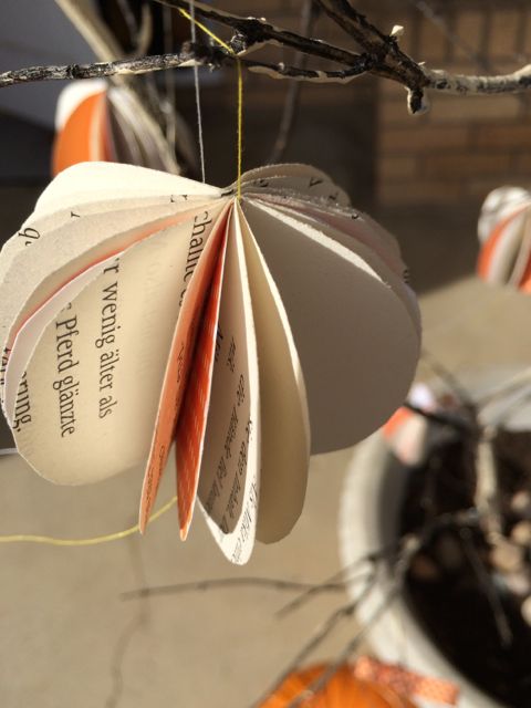 Our youngest pulled out pages out of our oldest daughters favorite book (Ostwind) and ripped these in tiny pieces. My idea was to put them back together like a puzzle and save them that way, but in the end we decided to replace the book and to use this one for decorating.
